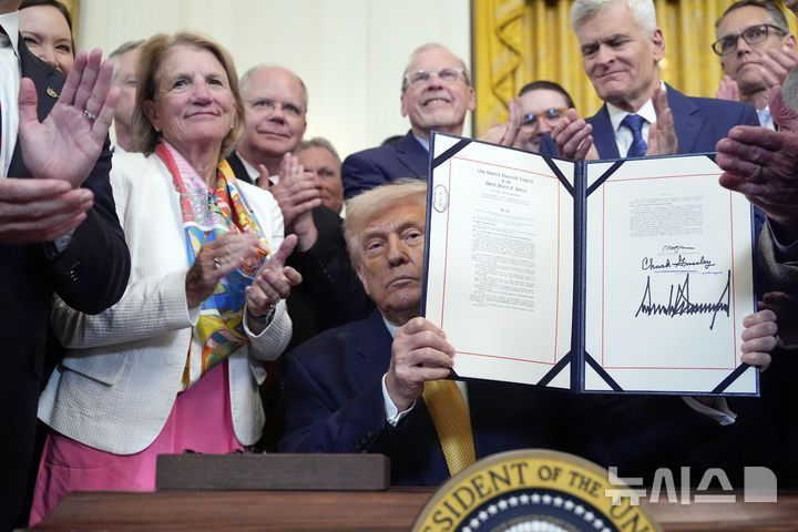 [워싱턴=AP/뉴시스] 도널드 트럼프 미국 대통령이 16일(현지 시간) 워싱턴 백악관에서 열린 서명식에서 '펜타닐의 치명적인 밀매를 모두 중단하라' 법안에 서명하고 있다. 2025.07.16