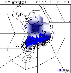 기상청이 7월 17일(목) 오후 5시 40분 발표한 기상특보에 따라, 같은 날 18시부터 전남 순천의 호우주의보가 호우경보로 상향됐다. 순천뿐 아니라 광양, 정읍, 울산서부, 대구 대부분 등으로 경보 발효 지역이 확대됐다.