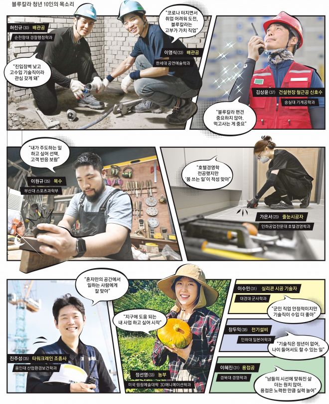 건설현장에서 철근공 신호수로 일하는 김상윤(37)씨도 “소위 화이트칼라라고 하면 기업 사무직을 올리는데 중소기업 월급이나 복지가 기대에 미치지 못하는 경우도 많다”면서 “건설 현장에서 일하는 기술자 중 고소득자가 꽤 있다”고 강조했다. 스무살에 도배일을 시작한 박서영(20)씨는 “힘든만큼 돈이 들어오는 것도 재미”라고 말했다.