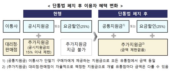 번호이동·신규가입 등 가입유형별 지원금과 요금제별 지원금에 대한 엄격한 차별금지 규정도 없어져 이동통신사와 유통점은 다양한 형태로 단말기 지원금 영업 경쟁을 할 수 있게 된다.