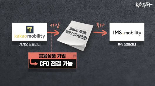 그런데 여기에는 맹점이 있다. 카카오모빌리티는 IMS에 직접 투자를 한 게 아니라는 점이다. 직접 투자를 하는 대신 오아시스 에쿼티가 만든 ‘오아시스 제3호 제이디 신기술조합’에 가입을 했고, 해당 조합이 IMS에 투자를 하는 구조인 것이다.