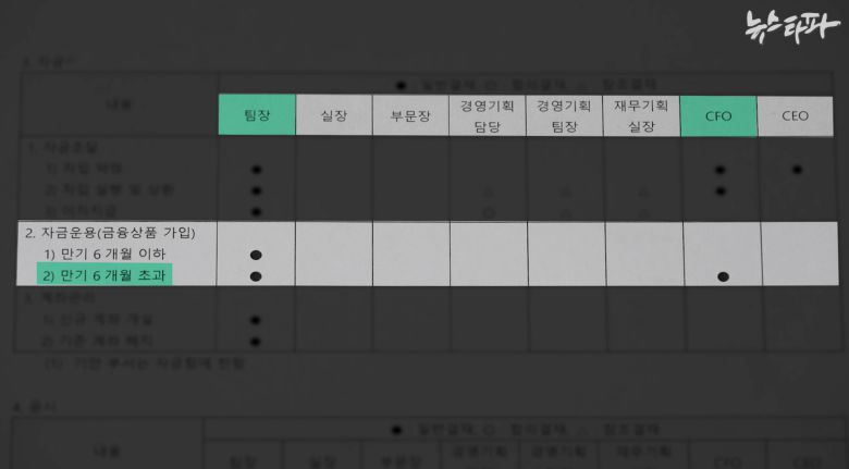 “전결로 이렇게 할 수 있는 회사 의사 (결정)은 없고요. 그리고 당연히 단돈 몇 억이라도 이제 투자라는 게 이루어지려면 다른 보고들이나 이런 것들이 다 이루어져야 되고 승인도 그렇게 해야되고.. 그게 없이 그렇게 막 전결로 이루어지는 금액은 사실상 거의 없습니다.그러나 뉴스타파 취재 결과 이 씨의 주장은 사실과 달랐다. 뉴스타파가 카카오모빌리티의 자금 전결 규정을 입수해 살펴보니 카카오모빌리티의 IMS 투자는 CFO 전결로 가능했다.