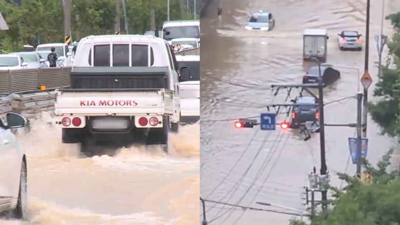 충남 서산에선 차량들이 줄지어 침수된 도로를 간신히 건너갑니다.