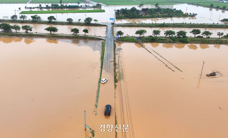 이틀 사이 520mm에 가까운 많은 비가 쏟아진 충남 서산시 석림동 청지천 일대에서 차량들이 침수된 도로와 논 사이에 갇혀 있다. 기상청은 서산 등 충남권에 내린 비의 양이 ‘200년에 한 번 내릴 수준’이라고 밝혔다. 또한 이날 오전 1시 46분부터 1시간 동안 서산에 114.9㎜의 비가 쏟아진 것은 ‘100년 만에 한 번 나타날 수준’의 강도라고 설명했다. 2025.7.17 서산|성동훈 기자 |