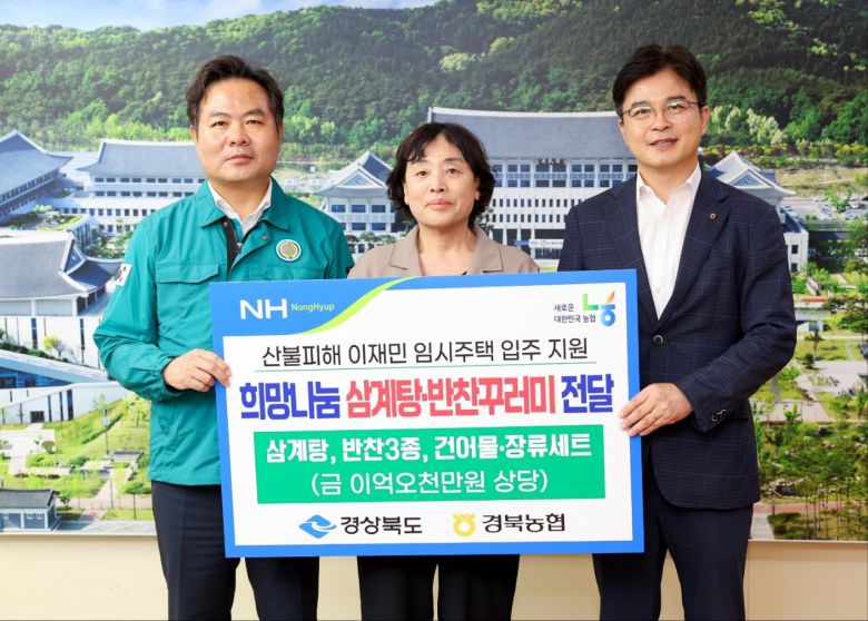 농협 경북지역본부(본부장 최진수)는 17일, 산불로 피해를 본 이재민을 돕기 위해 경북도청에서 2억 5천만원 상당의 기부 물품(반찬, 삼계탕 등)을 경북도에 전달했다