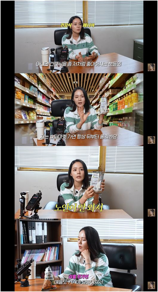 한가인은 “이런 과자를 고르는 기준은 당류를 본다. 당류가 높아버리면 혈당이 확 치솟으니까, 가뜩이나 이게 탄수화물이니까 설탕이 많이 들어가면 스파이크를 칠 수 있어서 영양 성분을 본다”라면서 “저는 슈퍼마켓 보면 항상 봉지 뒷편을 본다. 아직은 노안이 안 와서 이걸 읽을 수 있지만”라며 털털하게 웃어 보였다./osen_jin0310@osen.co.kr