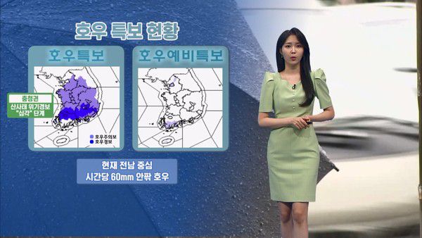 특히 충청권을 중심으로는 시간당 100mm 이상 극한 호우가 쏟아지면서 산사태 위기 경보 심각 단계가 발령 중이고요. 현재 강한 비구름은 주로 전남지역에 머물고 있습니다. 남부지방 중심으로는 호우경보가, 서울을 제외한 중부지방 곳곳에는 호우주의보가 발효중인데요.