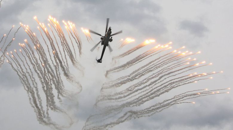 2020년 모스크바 국제군사기술포럼에서 에어로빅팀의 밀미-28 헬기가 시범 비행을 하고 있다./러시아 국방부 |