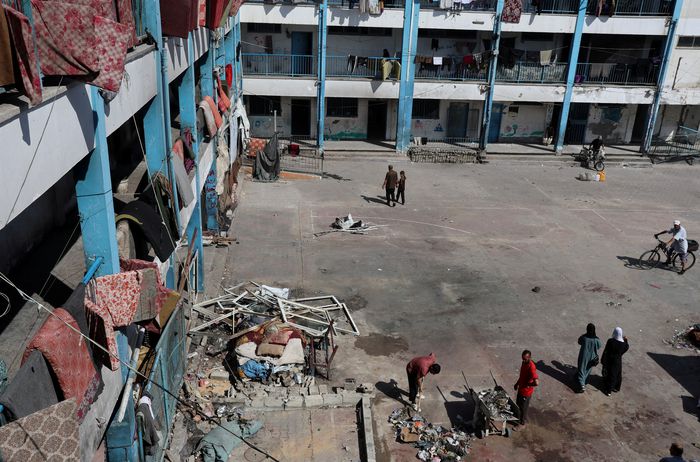 17일(현지시간) 가자지구 피란민들이 지내는 한 학교 건물이 폭격을 맞은 모습. [사진 = 로이터 연합뉴스] |