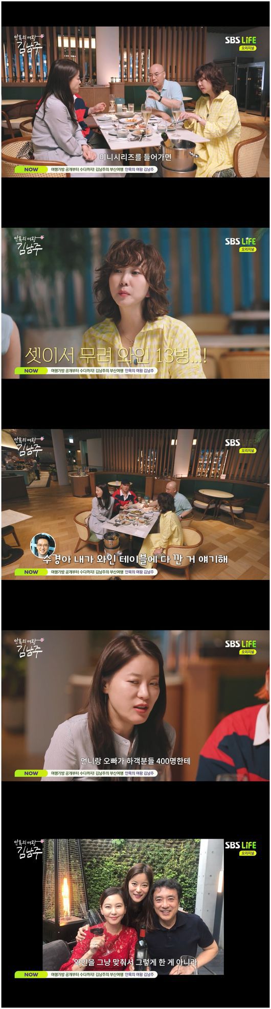 이어 김승우는 “내가 와인 돌린 거 말해줘라”라며 테이블을 향해 넌지시 말했다. 메이크업 담당은 “하객 400명에게 승우 오빠랑 남주 언니가 하객 테이블에 다 와인을 두고, 모든 하객들에게 라벨 별로 와인 400병을 선물했다”라며 이들 부부의 대단한 인품에 대해 말해 모두를 깜짝 놀라게 했다./osen_jin0310@osen.co.kr