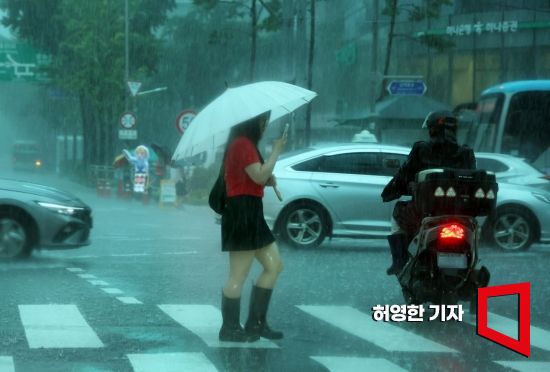 수도권과 중부지방을 중심으로 강한 비가 내린 17일 서울 광화문 사거리를 지나는 시민들이 우산과 장화 등으로 무장한체 발걸음을 서두르고 있다. 2025.07.17 윤동주 기자