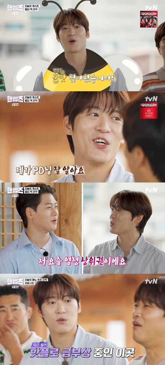 존박은 "요즘 꿀 빨고 계시지 않냐. 그래서 저도 오늘 사실 꿀 빨러 왔다. 가수 존박이다"라며 밝혔고, 차태현은 "보긴 봤냐. 우리 카드 내야 되는데"라며 물었다.
