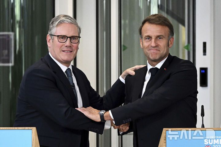 [런던=AP/뉴시스] 에마뉘엘 마크롱(오른쪽) 프랑스 대통령과 키어 스타머 영국 총리가 10일(현지 시간) 영국 런던에서 공동 기자회견을 하면서 악수하고 있다. 마크롱 대통령은 러시아-우크라이나 휴전 직후 우크라이나에 '의지의 연합'을 배치할 것이라고 밝혔다. '의지의 연합'은 우크라이나 전후 안전 보장을 지원하기 위해 영국, 프랑스 주도로 결성한 서방 위주의 자발적 연합체로 평화유지군, 안심 보장군 등으로도 불린다. 2025.07.17. |