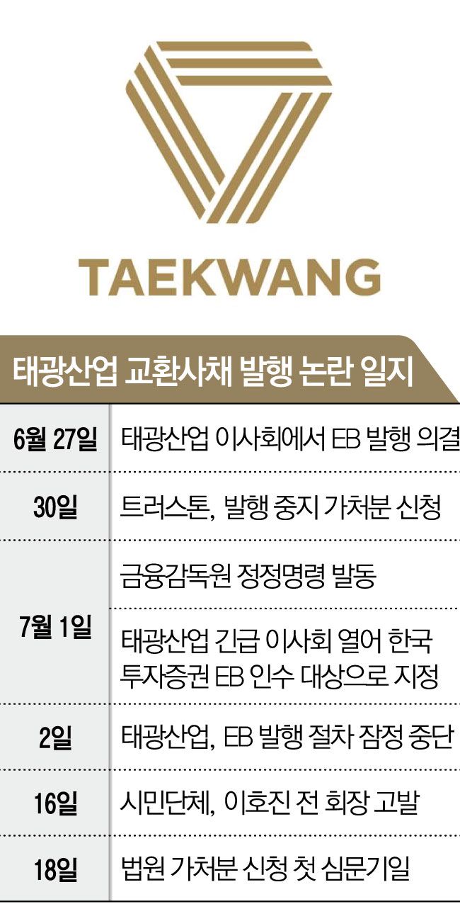 하지만 시장에서는 정부의 상법 개정, 자사주 소각 의무화 등이 법제화되기 전 태광산업이 무리하게 EB 발행으로 자금 확보와 대주주 경영권 방어에 나서는 게 아니냐는 비판이 나왔다. 태광산업 유동자산이 3조 원에 육박하는데 자사주 매각으로 자금 조달에 나선다는 게 앞뒤가 맞지 않다는 지적이다.