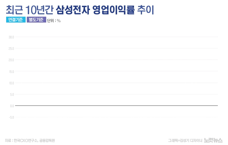 기술 초격차 경쟁력을 상실하면서 실적 부진도 이어지고 있다. 최근 10년 간 삼성전자의 영업이익률을 보면 지난 2018년 정점을 찍은 후 2021년 잠시 반등했다가 최근 들어 다시 하락세가 이어지고 있다.