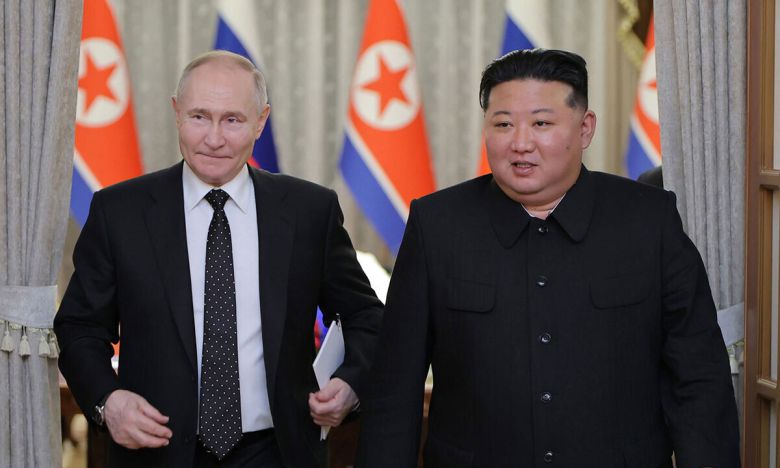 김정은 북한 국무위원장(오른쪽)과 블라디미르 푸틴 러시아 대통령. 평양 조선중앙통신=연합뉴스