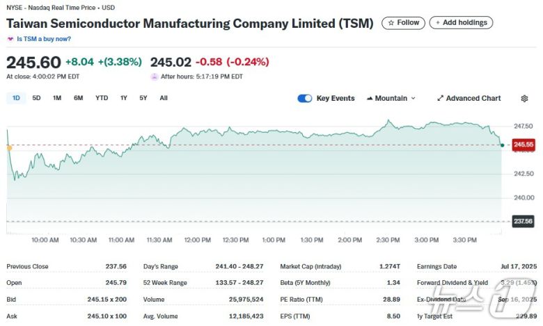 (서울=뉴스1) 박형기 기자 = 대만의 TSMC가 전일 깜짝 실적을 발표, 미국증시에 상장된 TSMC의 주가가 3.38% 급등한 245.60달러를 기록했다. 이는 사상 최고치다.
