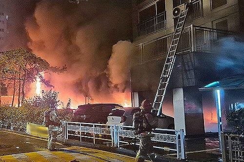 광명 아파트 주차장 화재 (광명=연합뉴스) 지난 17일 오후 9시 10분께 경기도 광명시 소하동의 한 아파트 주차장에서 불이 나 소방대원들이 진화 작업을 하고 있다. 2025.7.17 [독자 제공. 재판매 및 DB 금지]