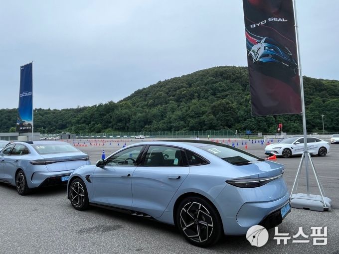 [용인=뉴스핌] 조수빈 기자 = 15일 용인 스피드웨이에서 BYD 전기 세단 씰의 시승 행사가 진행됐다. [사진=조수빈 기자] 2025.07.16 beans@newspim.com