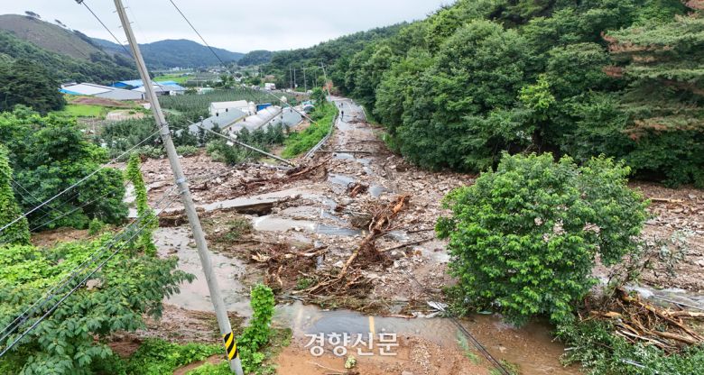 지난 17일 충남 서산시 한 국도가 폭우에 쓸려 내려온 토사에 막혀 있다. 서산|성동훈 기자