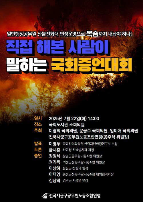 이번 토론회는 이광희·임미애·문금주 국회의원과 시군구연맹이 공동 주최하며, 산불진화에 투입됐던 지방자치단체 일반직 공무원들이 토론자로 나서 생생한 경험을 바탕으로 산불진화대 운영의 구조적 문제를 진단하고 한계점과 개선 필요성을 증언한다.
