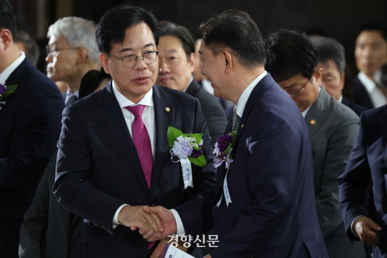 송언석 국민의힘 비상대책위원장 겸 원내대표(왼쪽)가 지난 17일 국회에서 열린 제77주년 제헌절 경축식에서 김병기 더불어민주당 대표 직무대행 겸 원내대표와 악수하고 있다. 국회사진기자단