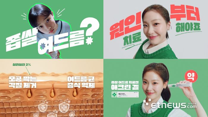 신규 광고 영상은 깨끗한 세안과 꾸준한 피부관리로도 지속 발생하는 좁쌀여드름을 보여주며 좁쌀여드름을 없애기 위해서는 근본적인 원인을 치료해야 한다고 전한다. 이어 애크린 겔의 주성분인 살리실산 2%를 통한 각질 제거 및 여드름균 증식 억제 효능을 강조하며 '좁쌀여드름 치료에는 애크린 겔'의 나레이션으로 마무리한다.