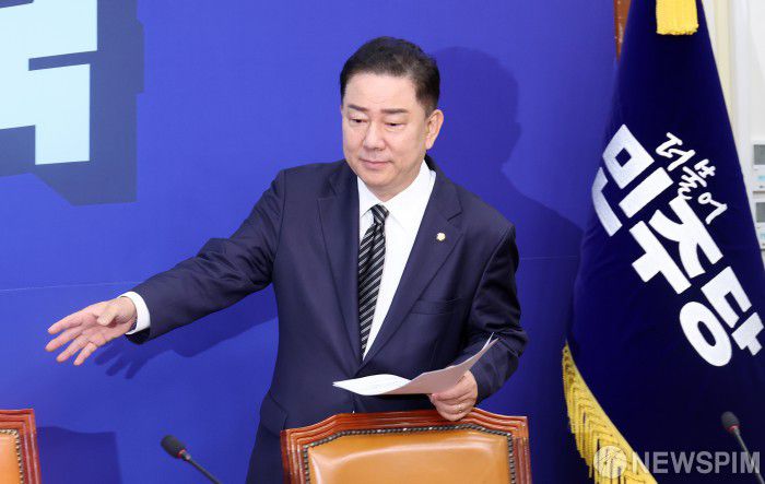 [서울=뉴스핌] 정일구 기자 = 김병기 더불어민주당 대표 직무대행 겸 원내대표가 18일 오전 서울 여의도 국회에서 열린 최고위원회의에 참석하고 있다. 2025.07.18 mironj19@newspim.com