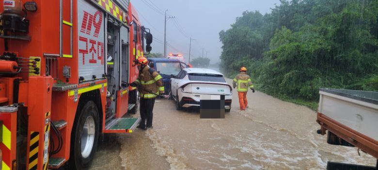 경북 청도에서 집중 호우로 침수된 도로를 소방대원들이 통제하고 있다. 경북소방본부 제공 |