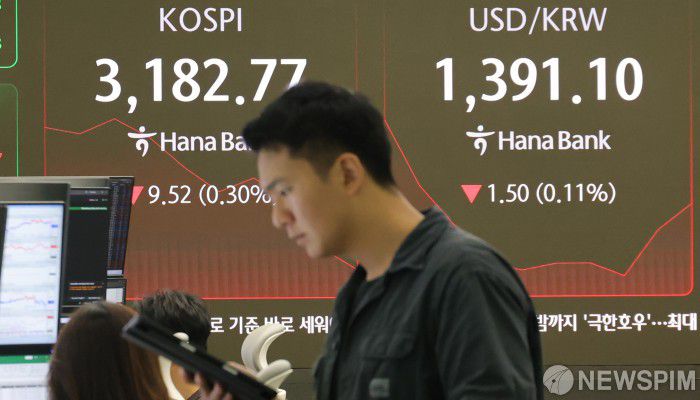 [서울=뉴스핌] 양윤모 기자 = 18일 오전 코스피가 전장 종가보다 9.52포인트(0.30%) 하락하며 3182.77로, 코스닥은 0.78포인트(0.10%) 상승한 819.05로 시작한 가운데, 서울 중구 하나은행 딜링룸에서 직원들이 업무를 보고 있다.서울외환시장에서 원·달러 환율은 전장 대비 1.50원 하락한 1391.10원에 거래를 시작했다. 2025.07.18 yym58@newspim.com