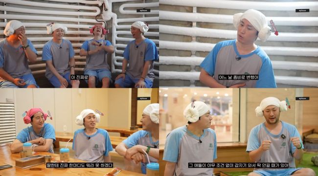 이날 에픽하이는 영화 '좀비딸' 개봉을 앞둔 조정석과 함께 찜질방에서 특별한 이야기를 나눴다. 이들은 찜질방 옷과 함께 양머리를 맞춰 착용해 친근한 매력을 발산했다.