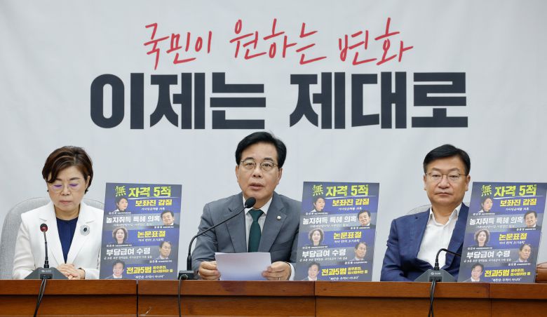 한편 국민의힘 지도부는 일부 장관 후보자들을 향해 ‘무자격 5적’이라며 공세를 이어갔다. 송언석 원내대표는 이날 오전 국회에서 열린 원내대책회의에서 “이재명 정부 1기 내각 인선은 한마디로 총체적 인사 참사”라며 “어제에 이어 오늘 다시 한번 고장 난 인사 검증 시스템과 부적격 후보 문제 정리를 위해 조속히 이 대통령에게 면담을 요구한다”고 했다.