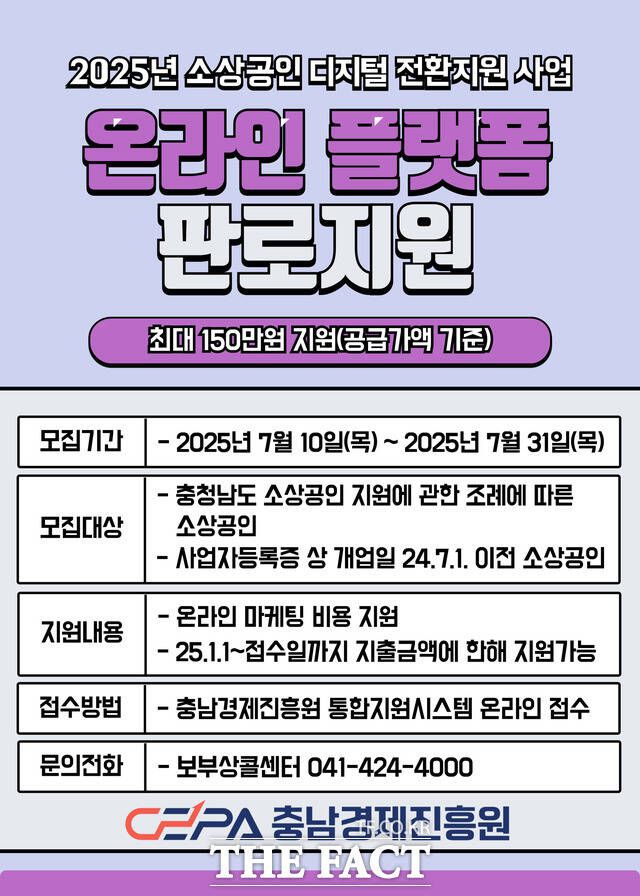 [더팩트ㅣ내포=이병수 기자] 충남경제진흥원(이하 진흥원)은 도내 소상공인의 판로 확대와 소비자 접점 강화를 위해 ‘2025년 온라인 플랫폼 판로지원 사업’ 참여 업체를 모집한다고 18일 밝혔다.