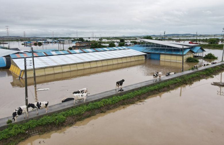 17일 오전 충남 예산군 고덕면 용리에서 하천 범람으로 침수된 축사에서 소들이 대피하고 있다. 2025.7.17/뉴스1 ⓒ News1 김기태 기자 /사진=뉴스1