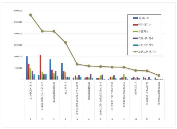 [박종규 기자] 한국기업평판연구소가 농림축산식품부 공공기관 브랜드평판 2025년 7월 빅데이터를 분석한 결과, 1위 한국농어촌공사 2위 한국농수산식품유통공사 3위 축산물품질평가원 순으로 분석됐다고 전했다.