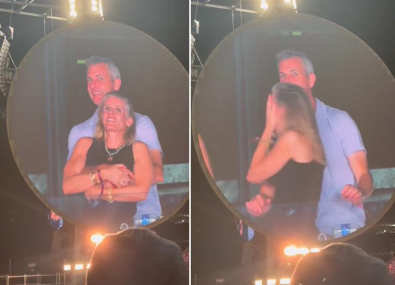 공연 도중 관객을 비추는 전광판에 백허그를 하던 중년 커플이 등장하자, 여성은 당황한 듯 손으로 얼굴을 가리고, 남성은 황급히 고개를 숙입니다.