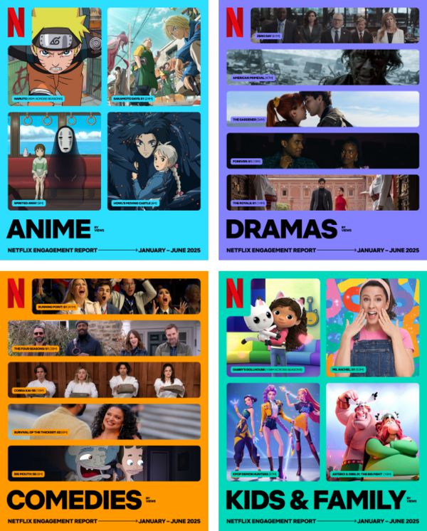 키즈·패밀리 부문은은 '케이팝 데몬 헌터스' 외 '개비의 매직 하우스'가 시즌 통합 1억800만 시청 수를 기록했다. '미스 레이첼' 시즌1과 '아스테릭스와 오벨릭스: 마을의 대결투'도 각각 5300만, 1600만으로 인기를 끌었다.
