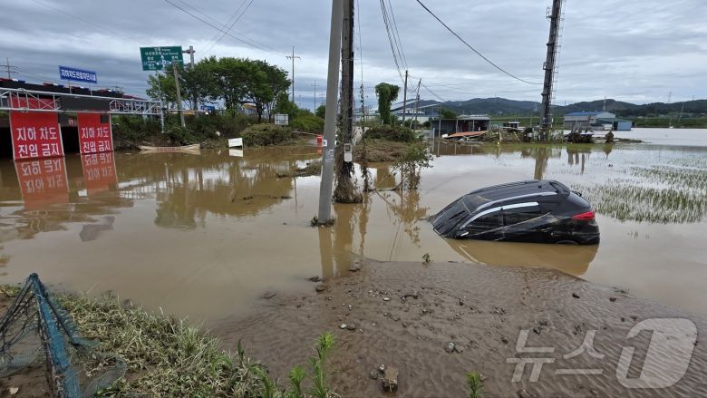 (아산=뉴스1) 이시우 기자 = 18일 충남 아산시 염치읍 곡교리 고불교 일대가 지난 폭우로 침수 피해가 발생했다. 지난 폭우로 미쳐 빠져 나가지 못한 차량이 물위에 떠 있다. 2025.7.18/뉴스1