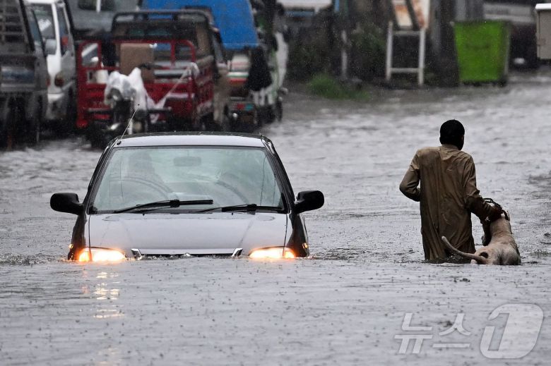 17일(현지시간) 파키스탄 라왈핀디에서 폭우로 인해 물에 잠긴 거리를 자동차와 개를 동반한 한 남성이 지나가고 있다. 2025.07.17 ⓒ AFP=뉴스1 ⓒ News1 김지완 기자 |