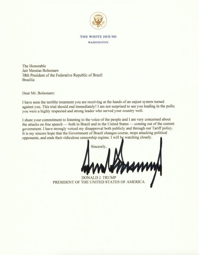 트럼프 대통령의 이날 서한 공개는 최근 브라질에 대한 상호관세를 기존 10%에서 50%로 올린 이유가 보우소나루 전 대통령에 내란 음모 혐의를 씌운 루이스 이나시우 룰라 다 시우바 현 브라질 정부에 대한 불만에서 비롯된 것임을 재확인하며 브라질 내정에 개입하려는 시도를 멈추지 않겠다는 의도로 읽힌다.