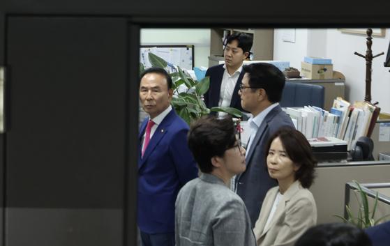 김건희 특검팀이 권성동 국민의힘 의원에 대한 압수수색을 진행중인 18일 서울 여의도 국회 의원회관 권성동 의원실에서 박덕흠 의원을 비롯한 국민의힘 의원들이 압수수색에 반발해 집결해 있다. 뉴시스 |