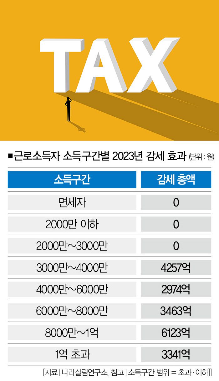 하지만 결괏값은 달랐다. 2023년 감세분을 분석해보니 소득 2000만원 이하 종합소득자와 연봉 3000만원 이하 근로소득자의 세금은 과세표준의 변동이 없어서 전혀 줄지 않았다. 소득 2000만~6000만원 종합소득자와 연봉 3000만~8000만원의 근로소득자는 1인당 18만원의 세금이 줄었다.