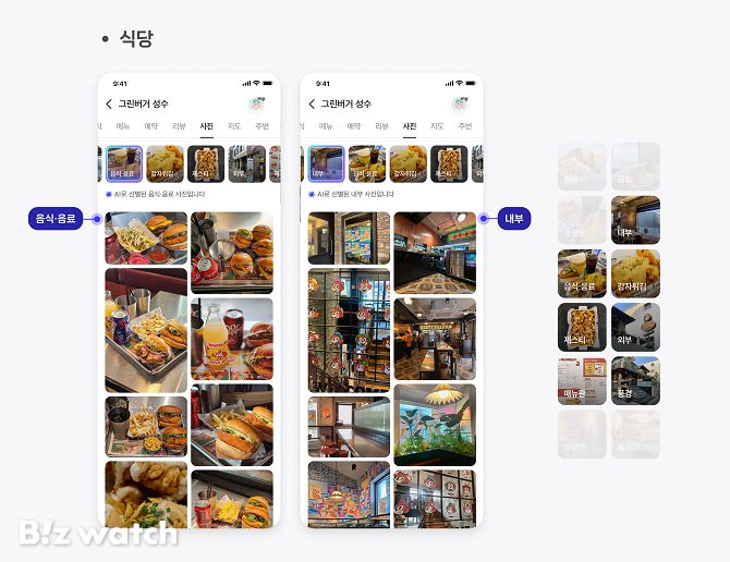 사용자는 장소의 업종에 따라 자주 찾는 정보를 반영한 맞춤형 필터를 적용해 검색할 수 있다. 예를 들어 식당은 '음식·음료', '메뉴', '풍경' 등의 하위 필터가 적용되며, 숙박 시설은 '객실', '전망', '수영장' 등의 테마, 미용실의 경우 '커트', '펌', '염색', '남성' 등 테마에 따라 AI가 이미지를 분류해 제공한다.