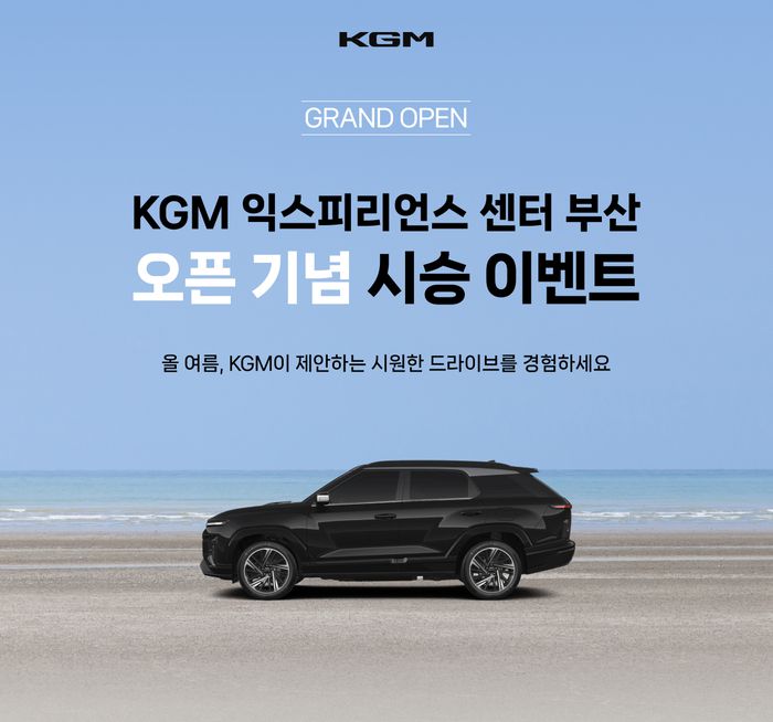 [스포츠서울 | 원성윤 기자] KG 모빌리티(이하 KGM)가 ‘KGM 익스피리언스 센터 부산’ 개관에 앞서 보다 많은 고객에게 다양한 시승 경험을 제공하기 위해 개관 기념 시승 모집 이벤트를 개최한다고 밝혔다.