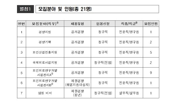 7개 각 모집 분야 및 인원은 경영지원 1명 경영기획 2명 보건산업진흥지원 5명 국제의료사업지원 2명 보건의료연구개발사업관리 9명 보건의료연구개발사업관리 1명(보훈대상자) 임원 비서 1명(실무원·청년)으로 구분된다.