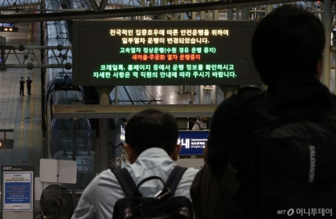 코레일 관계자는 "극한호우로 인해 열차 운행 중단 및 지연이 발생하고 있는 만큼 열차 이용 전 반드시 모바일 앱 '코레일톡'과 홈페이지, 철도고객센터를 통해 실시간 열차 운행 상황을 확인해 달라"고 당부했다.