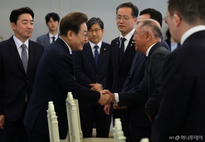 [서울=뉴시스] 최진석 기자 = 이재명 대통령이 13일 서울 용산 대통령실에서 열린 6경제단체와 기업인 간담회에 입장하며 정의선 현대차그룹 회장과 악수하고 있다. 2025.06.13. myjs@newsis.com /사진=최진석 |