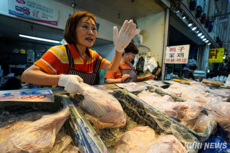 18일 서울 구로시장에 위치한 한 정육점은 생닭을 구매하는 시민들의 발길이 이어졌다. 생닭만 전문으로 취급하는 이 점포에서 10여분 종안 2만원 내외의 생닭이 총 5마리 팔렸다. 한동안 점원과 대화를 나누며 고민한 뒤 토종닭을 구매한 한(67)씨는 “가격이 부담되는 게 사실”이라면서도 “더운 날 보양식으로 먹으려고 일부러 큰 닭을 샀다”고 말했다.