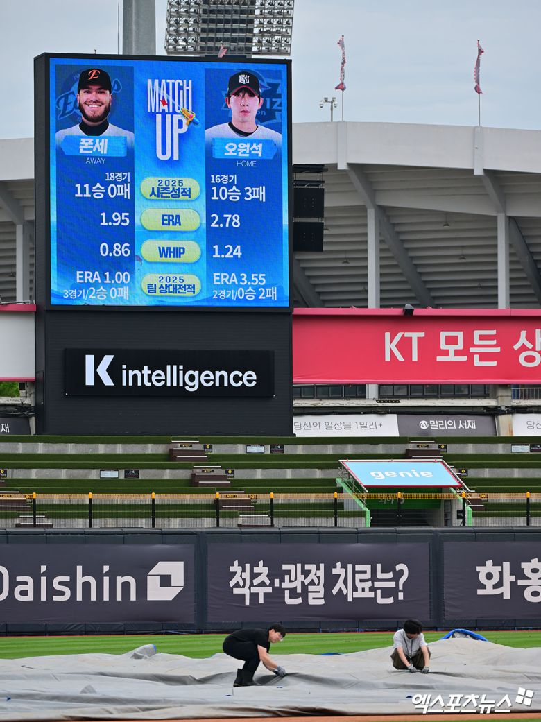 (엑스포츠뉴스 수원, 김한준 기자) 18일 오후 수원KT위즈파크에서 열리는 '2025 신한 SOL Bank KBO리그' 한화 이글스와 KT 위즈의 경기, 구장 관계자들이 방수포를 정리하고 있다.