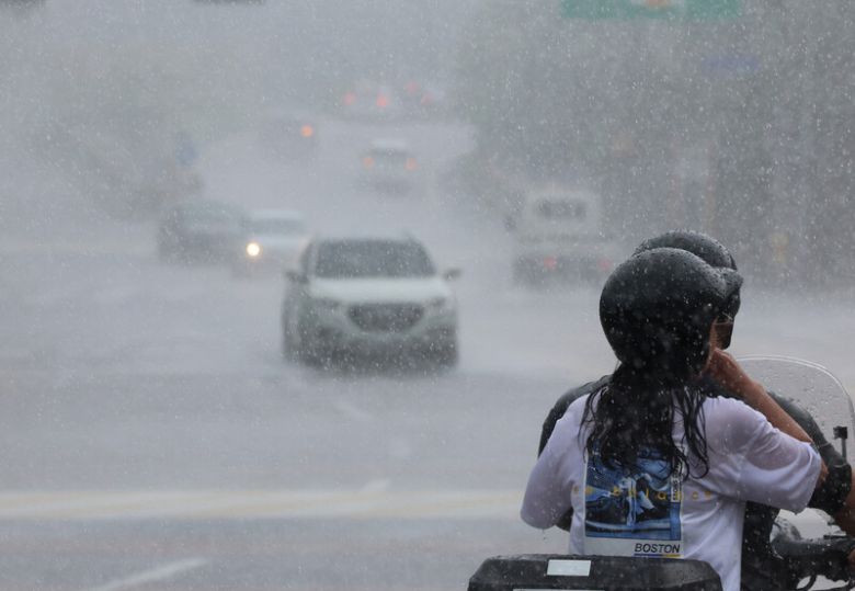 18일 오후 제주시 아라동 산천단 입구에 게릴라성 폭우가 쏟아지고 있다. 연합뉴스